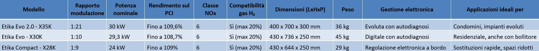 Le differenze principali riguardano rapporto di modulazione, potenza, dimensioni, funzionalità e compatibilità con gas contenente idrogeno: